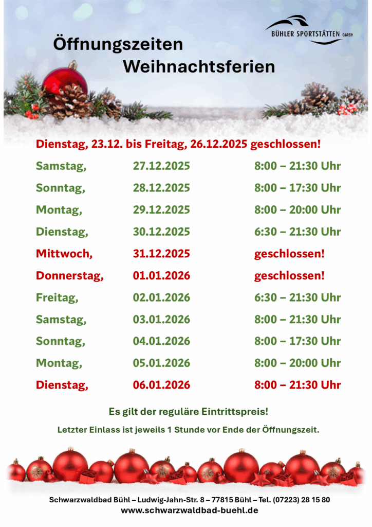 Änderungen der Öffnungszeiten bleiben vorbehalten.
