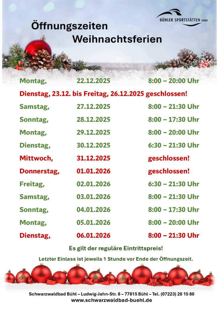 Änderungen der Öffnungszeiten bleiben vorbehalten.
