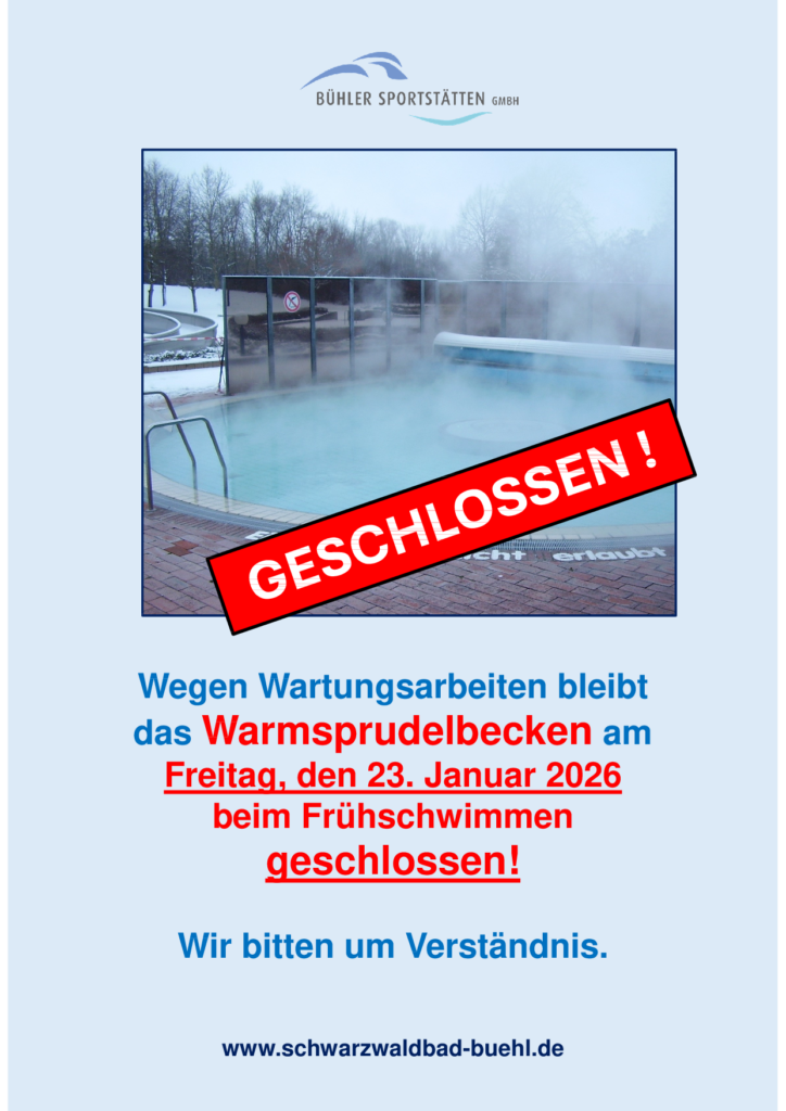 Wegen Wartungsarbeiten bleibt das Warmsprudelbecken am 23.1. beim Frühschwimmen geschlossen!